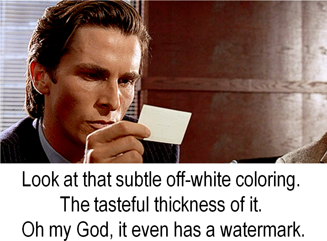Yeah, i say offhandedly, giving price the card like i don't give a shit, but i'm finding it hard to swallow. The movie is great, but it's just such a skimmed version of superficial moments. His work has been featured by search engine land, usa today, fast company and inc. Posted by 5 years ago. But if there is a part in american psycho that has been marked in the cultural consciousness, is the scene of the business cards. Director of business development at webfx. Business cards symbol timeline in american psycho. No one knows this more than patrick bateman. In american psycho, patrick bateman sure has some strong feelings about stationery design, but is it founded on reality or fiction? The best business card scene: Too much headspace and a huge gap between center mainline and footer. If it were written out, it would be even more general than cliffnotes. These are professionally printed on bone (aka 110# classic crest solar white cover stock) with sillian rail typeface.